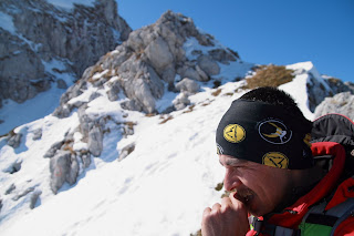Qualche passo scomodo per superare un saltino verticale un pò panciuto, in cui bisogna fidarsi dei piedi e delle punte dei ramponi perchè non si vede dove si fa presa. Qualche piccola spaccata su roccia, e anche un paio di passaggi in cui adoperare le mani guantate (saggiando la tenuta della pessima roccia prima).